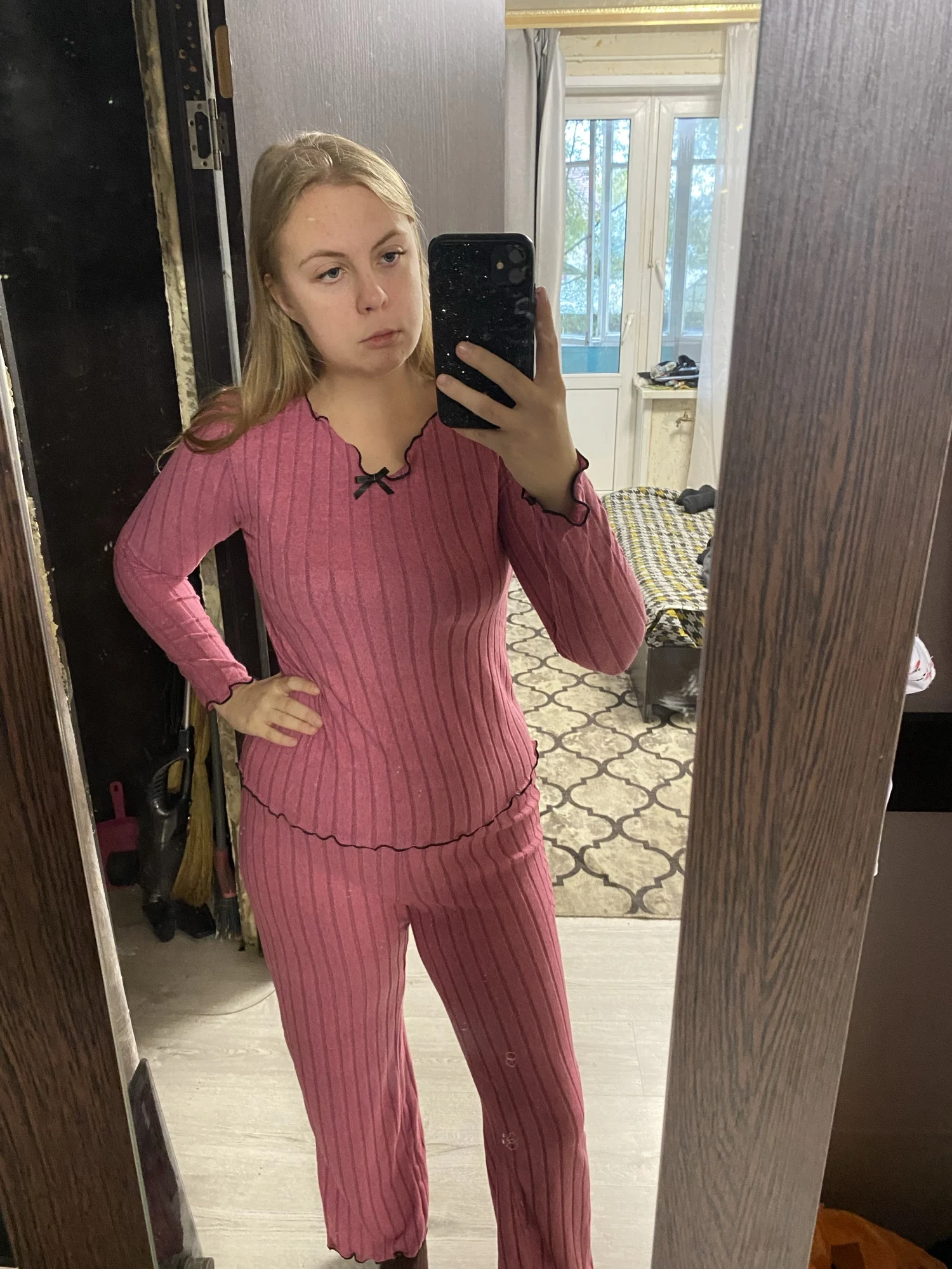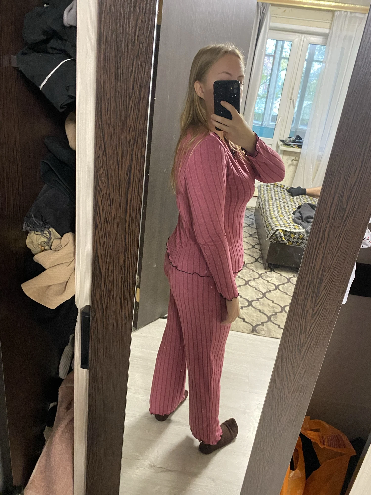 Excellent pajamas, thanks to the seller. The size fits perfectly. It's not as warm as it seems. The fabric is warm but thin. Therefore, it will be very comfortable in autumn and winter. For a height of 162 cm, the pants are the ideal length.